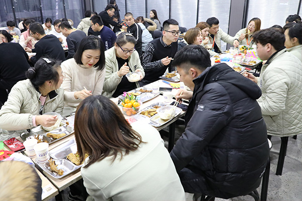 介紹一下公司準備的餐食,這些都是有講究的,有水餃(吃水餃是冬至習俗,餃子得有)、有丸子(代表著團團圓圓,數字也很吉祥,8代表著發)、炸魚(魚代表著年年有余)、有雞爪(代表著兩手抓錢,祝大家財源廣進),還有各種水果、飲料,應有盡有。