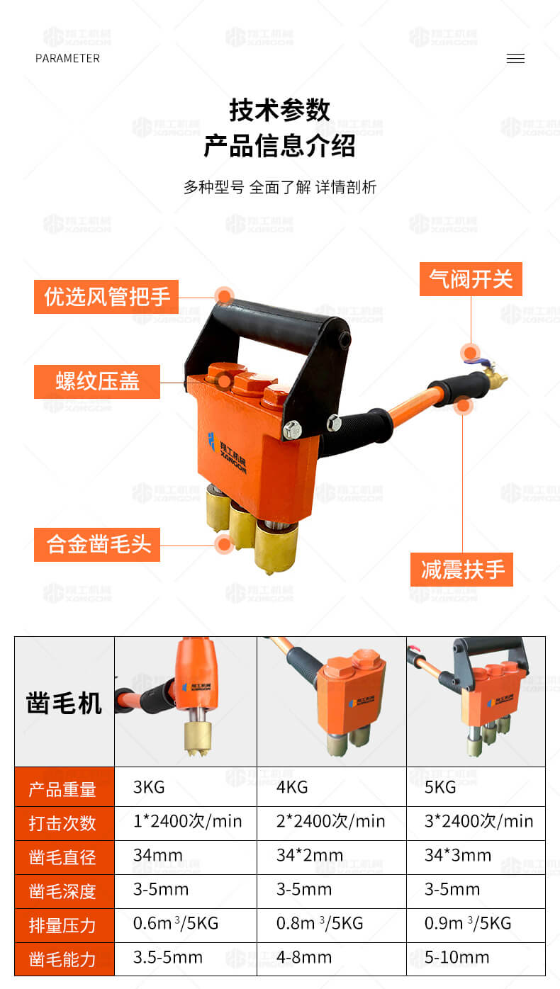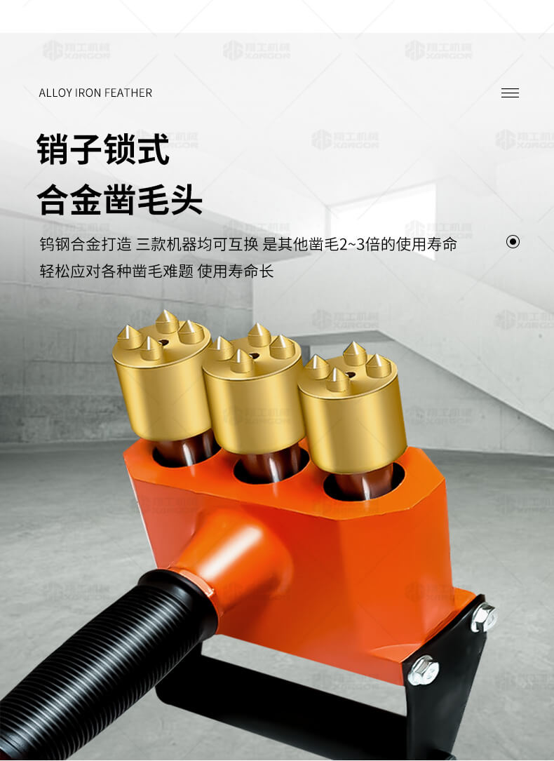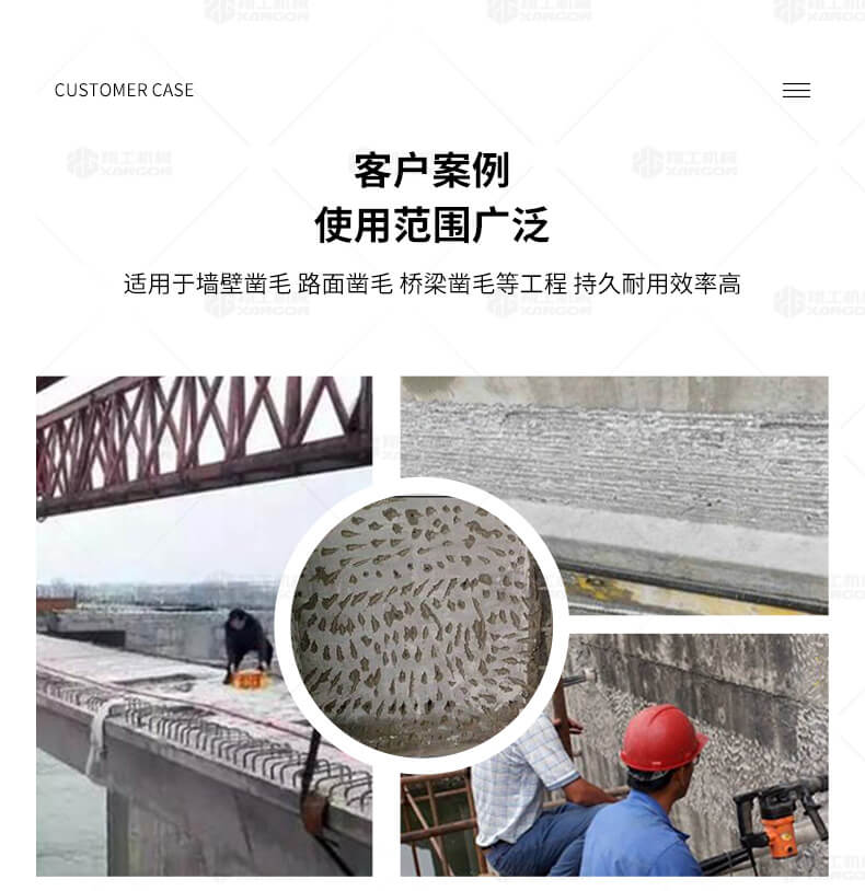 手持式鑿毛機主要用于混凝土剔鑿,水泥表面的打點、粗糙、清理浮漿;兩次鋪裝前清理舊的混凝土。 手持式鑿毛機是利用活塞打擊的方法在混凝土表面鑿毛,用來使新舊混凝土粘結