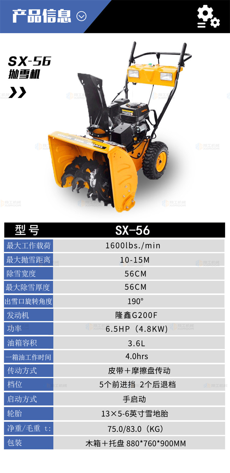 XG-56小型手扶自走清雪機(jī)掃雪機(jī)(黃色)