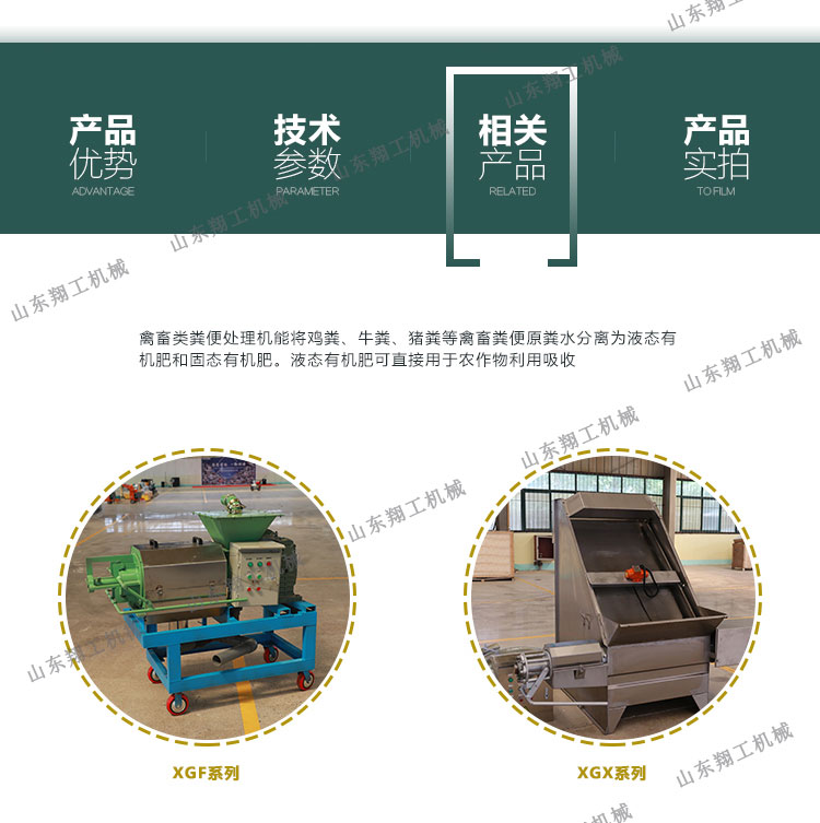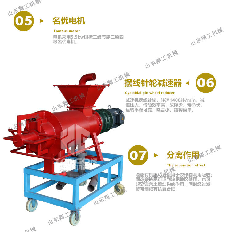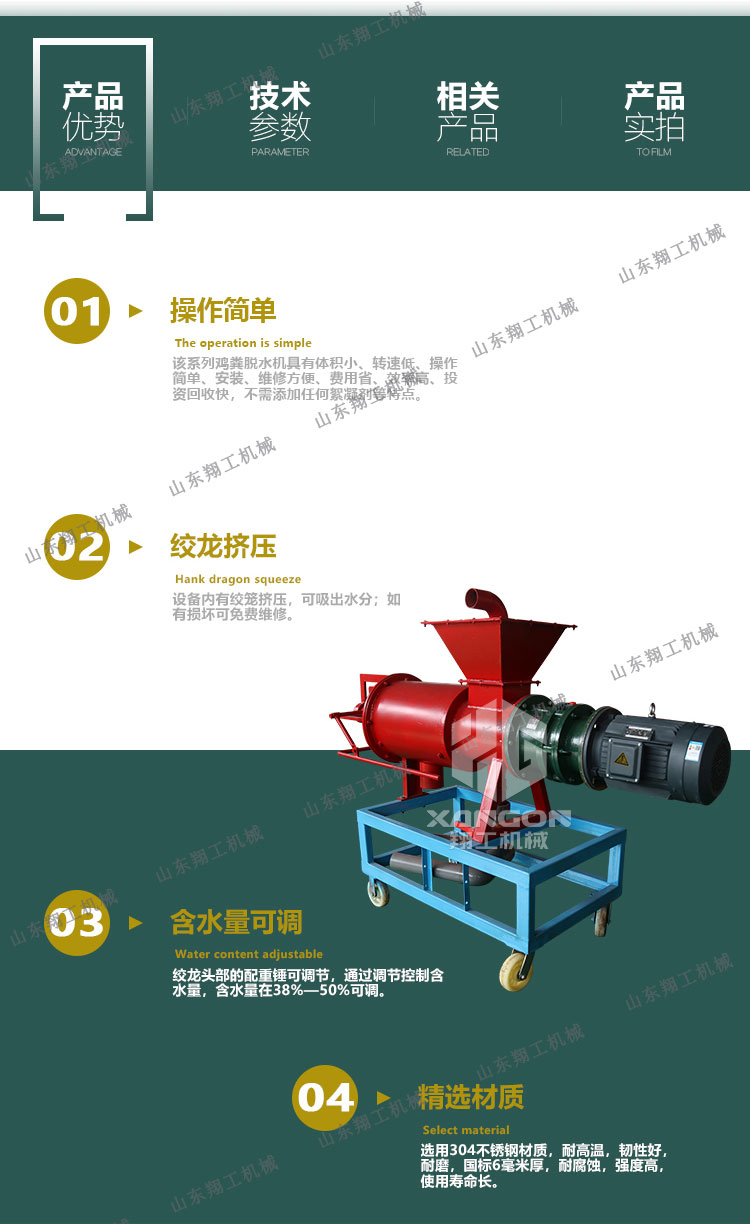 該系列雞糞脫水機(jī)具有體積小、轉(zhuǎn)速低、操作簡單、安裝、維修方便、費(fèi)用省、效率高、投資回收快,不需添加任何絮凝劑等特點(diǎn);該機(jī)采用的螺旋軸、篩網(wǎng)為不銹鋼制作;禽畜類糞便處理機(jī)能將雞糞、牛糞、豬糞等禽畜糞便原糞水分離為液態(tài)有機(jī)肥和固態(tài)有機(jī)肥;液態(tài)有機(jī)肥可直接用于農(nóng)作物利用吸收;固態(tài)有機(jī)肥可運(yùn)到缺肥地區(qū)使用,也可起到改觀土壤結(jié)構(gòu)的作用,同時經(jīng)過處理可制成有機(jī)復(fù)合肥。