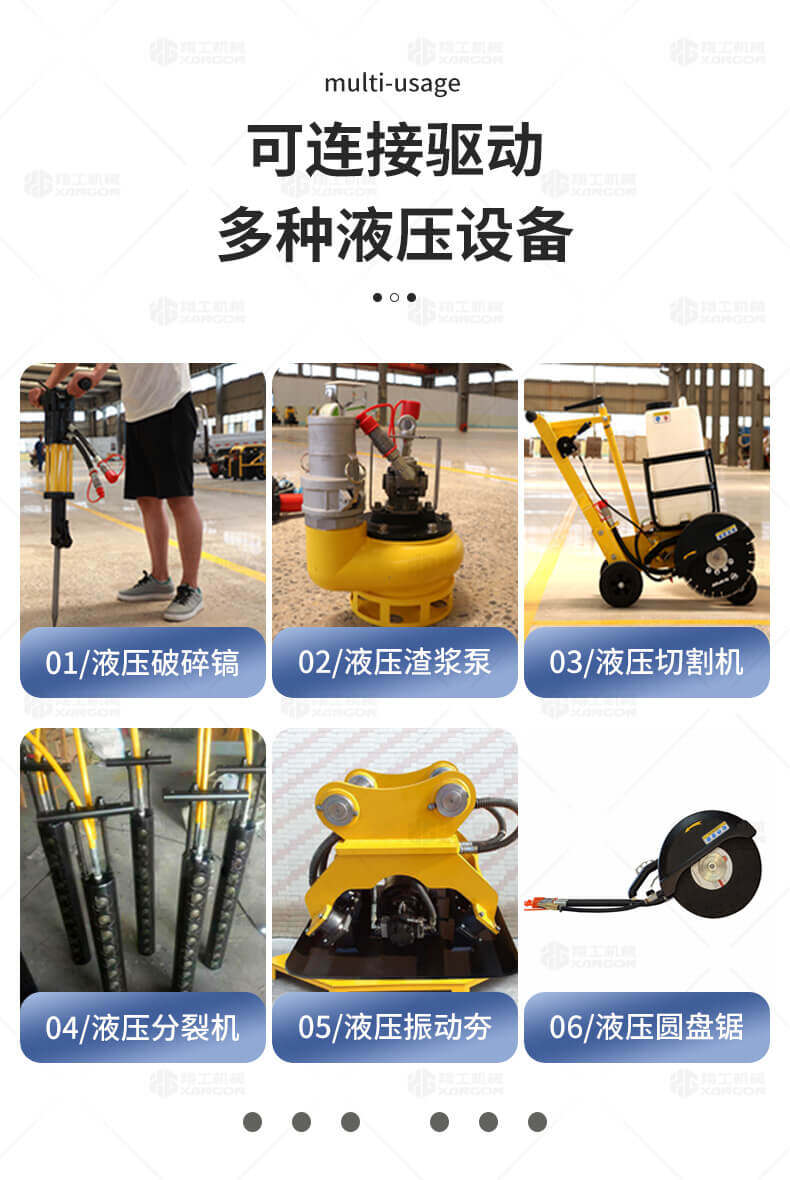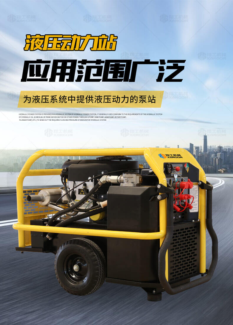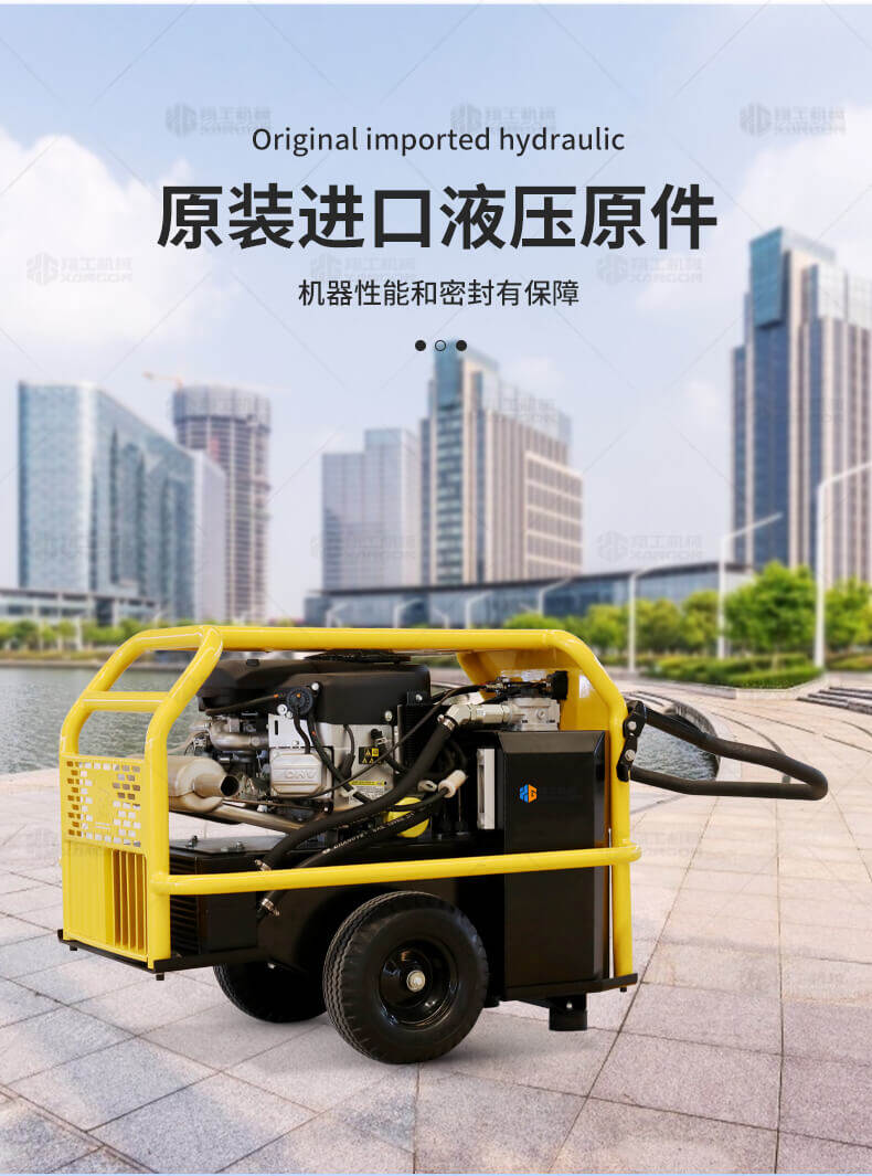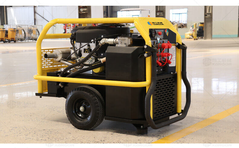 1.雙回路動力站,有兩個流量控制檔位2*20/2*30(Lpm),為兩個工具同時提供動力; 2.27馬力美國百力通雙缸汽油發動機; 3.電啟動; 4.可折疊扶手的護框和移動輪; 5.風扇降溫的大容量液壓油散熱器; 6.有負載反饋系統(POD),可節約燃油、減少噪音、延長發動機壽命; 7.配有工作計時表。