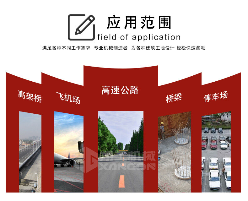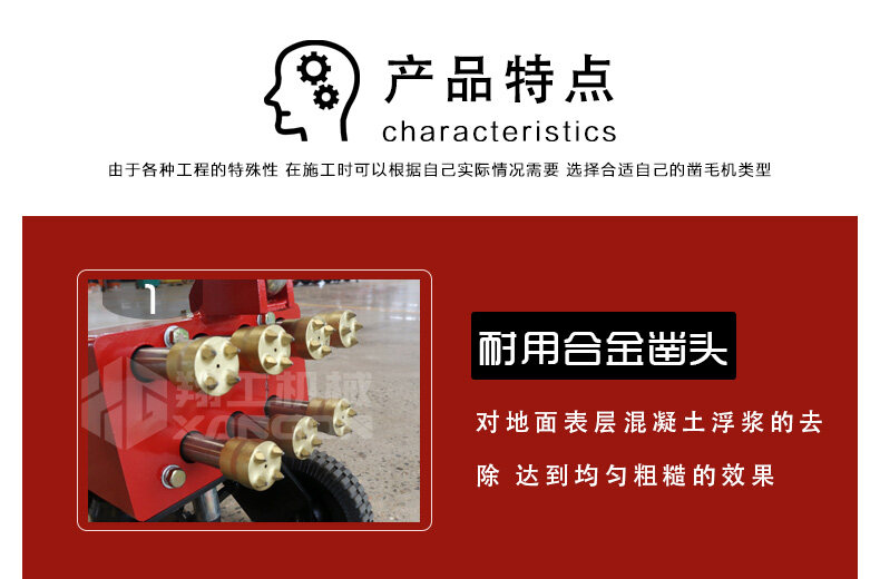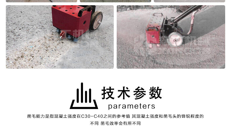 面鑿毛機,主要為高速公路、高速鐵路的橋面、機場、橋梁、停車場等各種混凝土地面新建鋪裝時對地面表層混凝土浮漿的去除,達到均勻粗糙而設計的。對各種陳舊地面做翻新前的地坪處理;去除破損地面凸起部分;環氧樹脂地面鑿毛;地面做防滑面;對需二次鋪裝新舊面層打毛等具