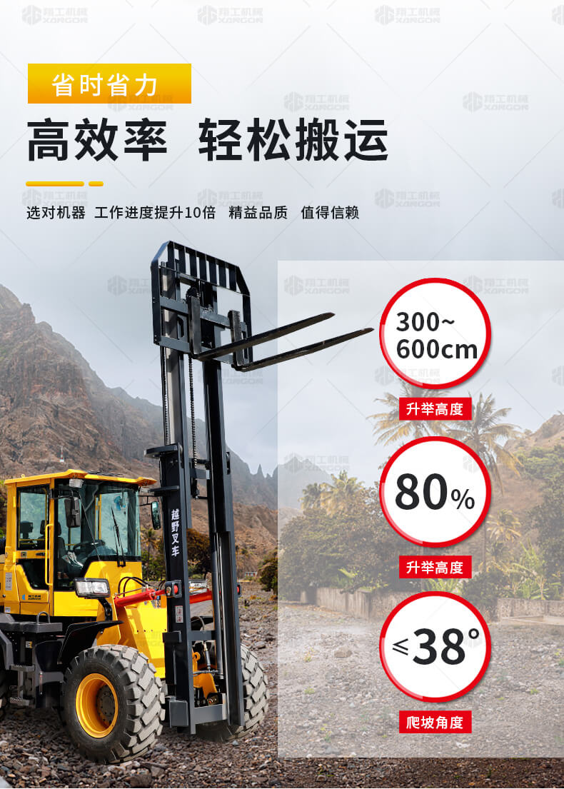 越野叉車適用于道路修筑、城市建設、環境衛生、石料場、中小型土木工程、車站、碼頭、貨場、倉庫等地方,主要用來轉運石料、設備、貨物、城市垃圾箱以及集裝物料等。