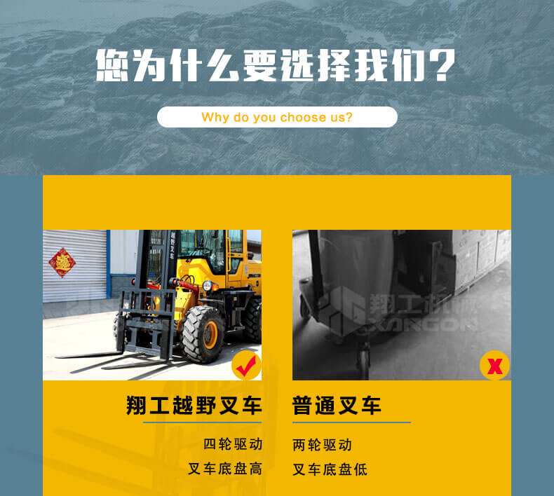 1.普通叉車是兩輪驅(qū)動的,而越野叉車是四輪驅(qū)動的。