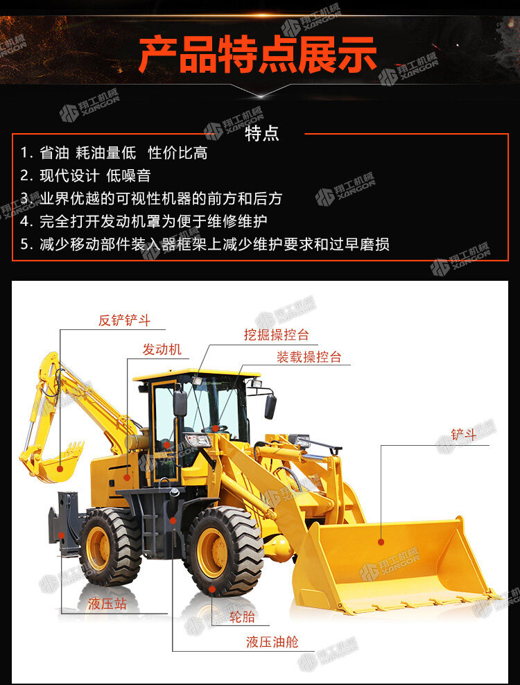 挖掘裝載機主要用于城市和農村的公路建設及養護、電纜鋪設、電力和機場工程、市政建設、農田水利建設、農村住宅建設、開山取石以及各種小型建筑隊所從事的各種建筑施工工程。