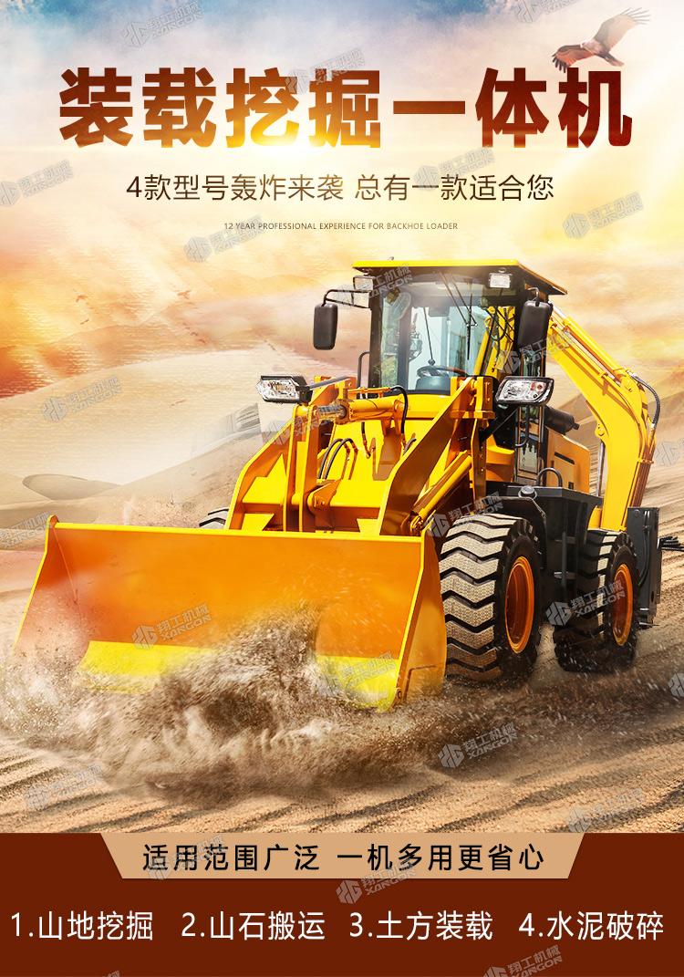 挖掘裝載一體機(jī)俗稱(chēng)“兩頭忙”。因?yàn)樗哂歇?dú)特的構(gòu)造,前端是裝載裝置,后端為挖掘裝置。在工地內(nèi),您只需要轉(zhuǎn)動(dòng)一下座椅,即可完成從裝載機(jī)到挖掘機(jī)操作手角色的轉(zhuǎn)變。“兩頭忙”屬于小型多功能工程機(jī)械的一種,一般在大工程完成后的小工程中使用。它可配多種工作裝置及輔具,進(jìn)行挖掘、鏟裝、路面破碎、平整場(chǎng)地、開(kāi)挖溝渠、鋪設(shè)管道等多種作業(yè)。