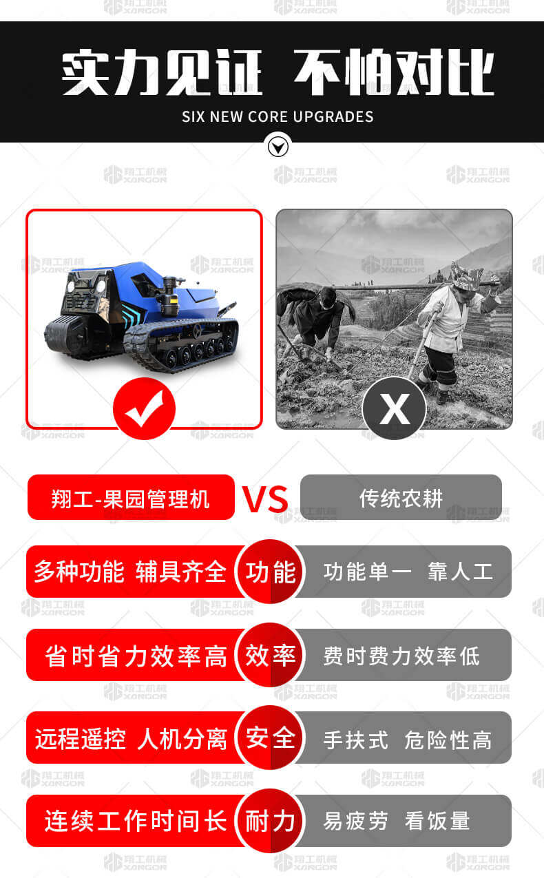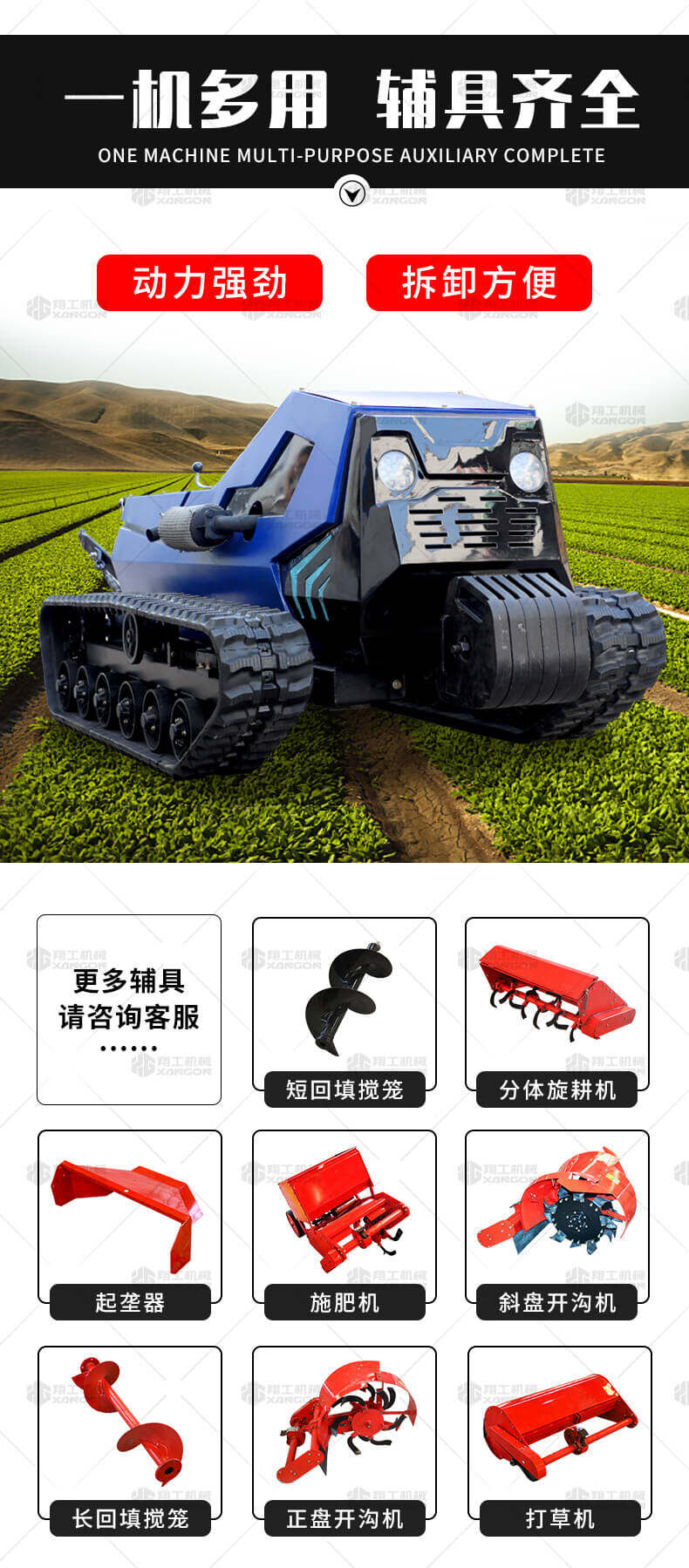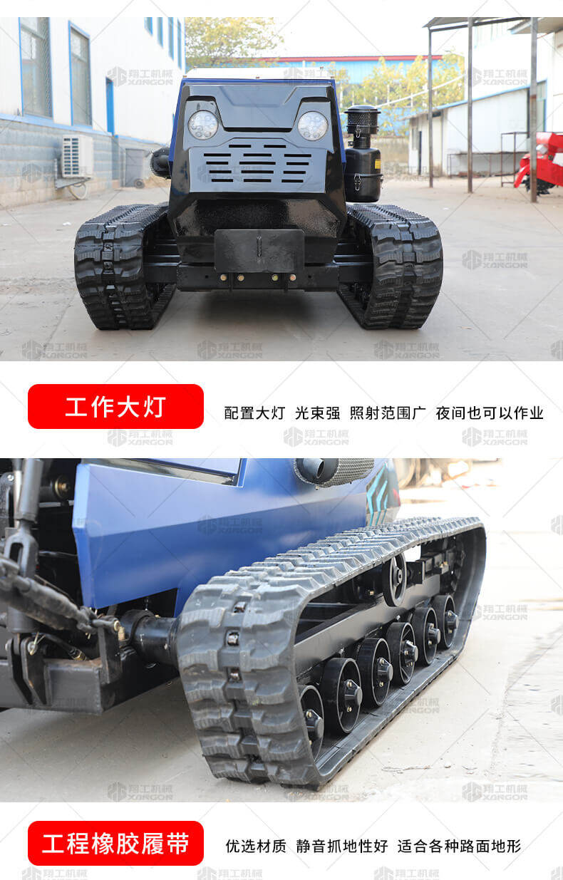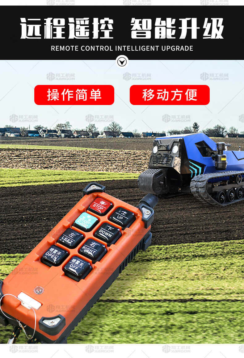 本產品采用履帶式驅動設計,穩定性和爬坡能力較強,適應丘陵山地平原各種地形,機型小功率大,適應各種行距的果樹,大棚,園林。產品動力強勁,結實耐用,性能優越,安全放心,遠程操控,省心省力。