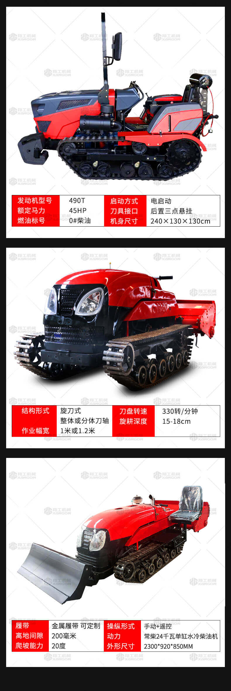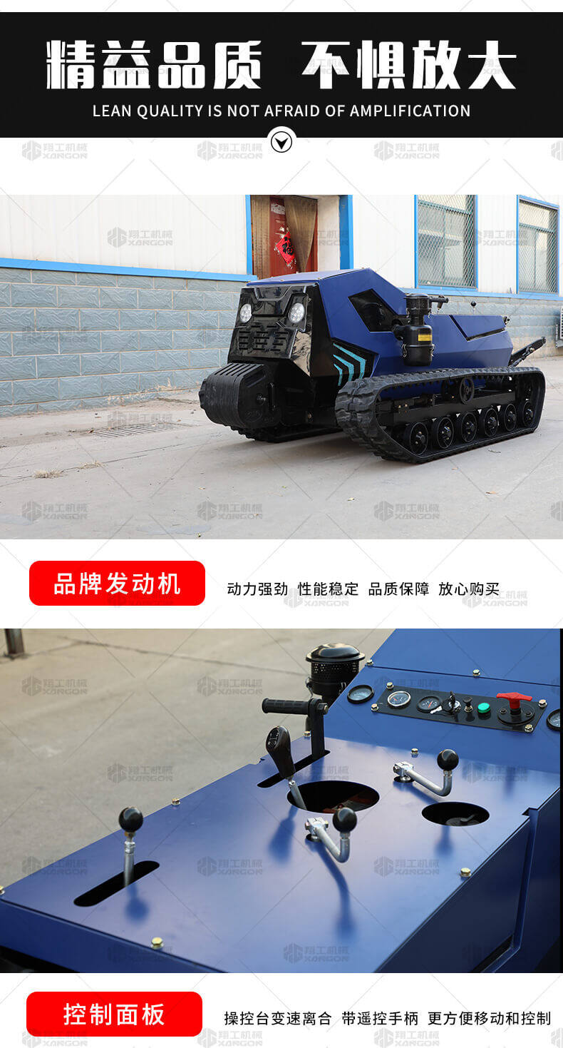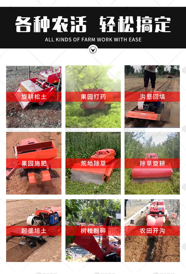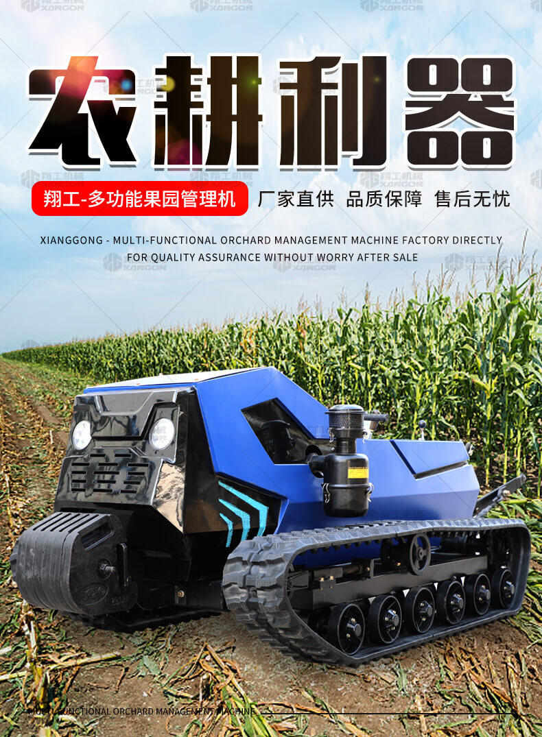 本產品采用履帶式驅動設計,穩定性和爬坡能力較強,適應丘陵山地平原各種地形,機型小功率大,適應各種行距的果樹,大棚,園林。產品動力強勁,結實耐用,性能優越,安全放心,遠程操控,省心省力。