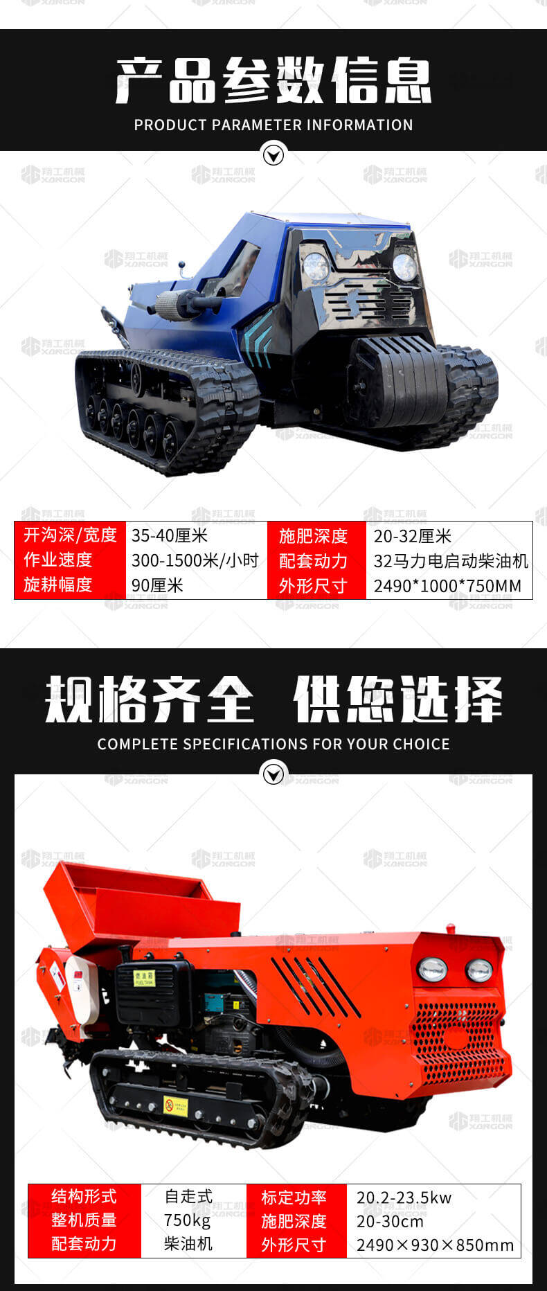履帶式開溝施肥機安裝上不同的配件可以進行單獨旋耕、回填、單獨開溝、施肥、也可混合搭配使用。