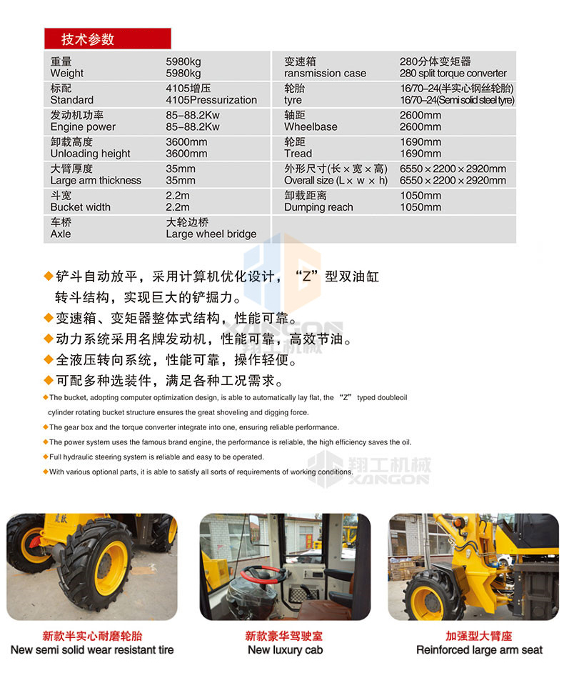 主要用于鏟裝土壤、砂石、石灰、煤炭等散狀物料,也可對礦石、硬土等作輕度鏟挖作業。換裝不同的輔助工作裝置還可進行推土、起重和其他物料如木材的裝卸作業。在道路、特別是在高等級公路施工中,裝載機用于路基工程的填挖、瀝青混合料和水泥混凝土料場的集料與裝料等作業。