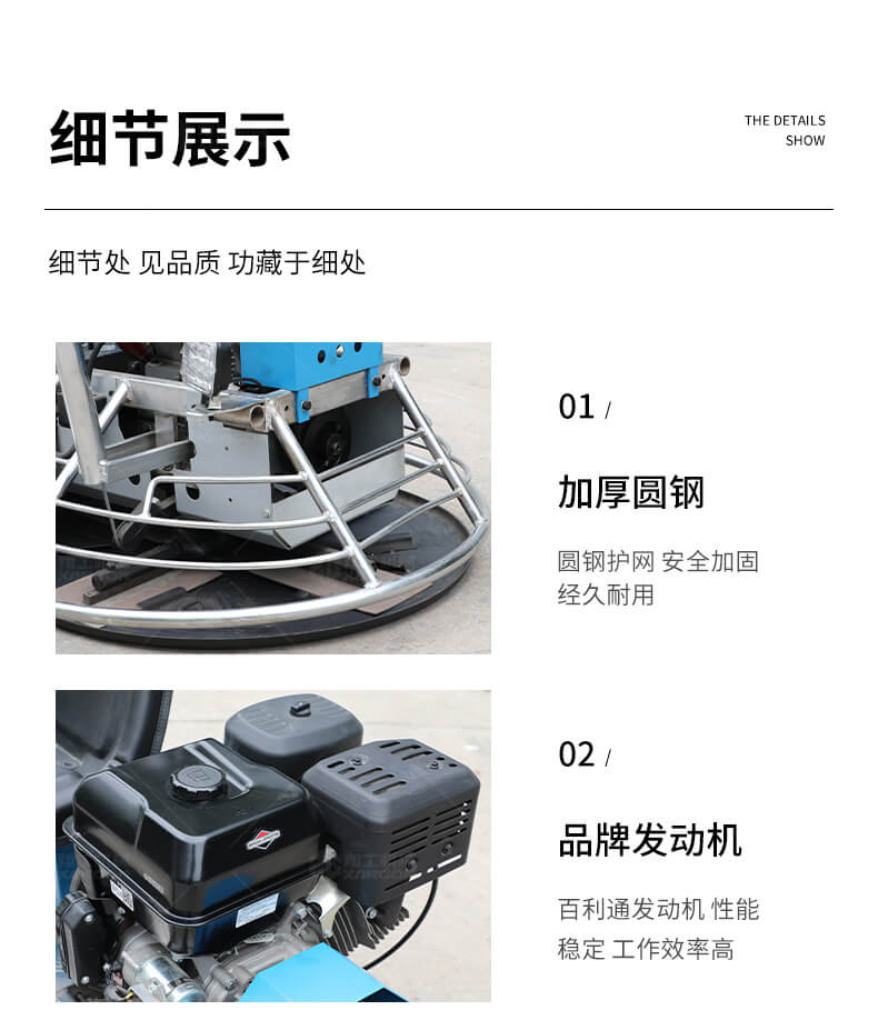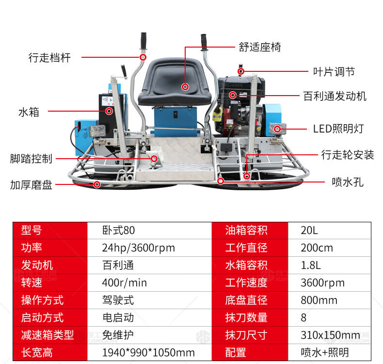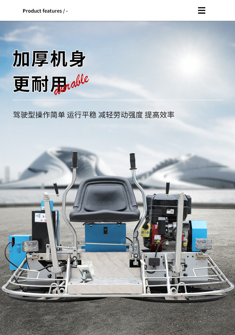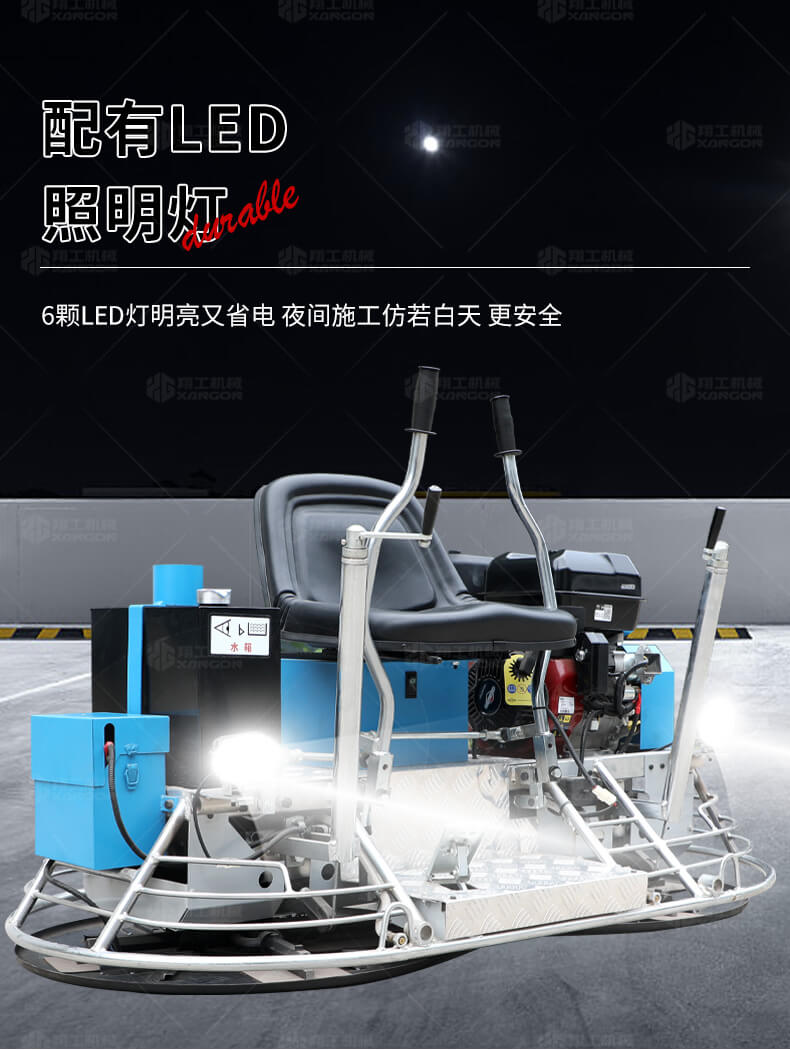 座駕式抹光機用于混凝土地面的提漿、壓實、抹平、抹光,座駕式操作大大降低了操作者勞動強度,提高了作業效率。