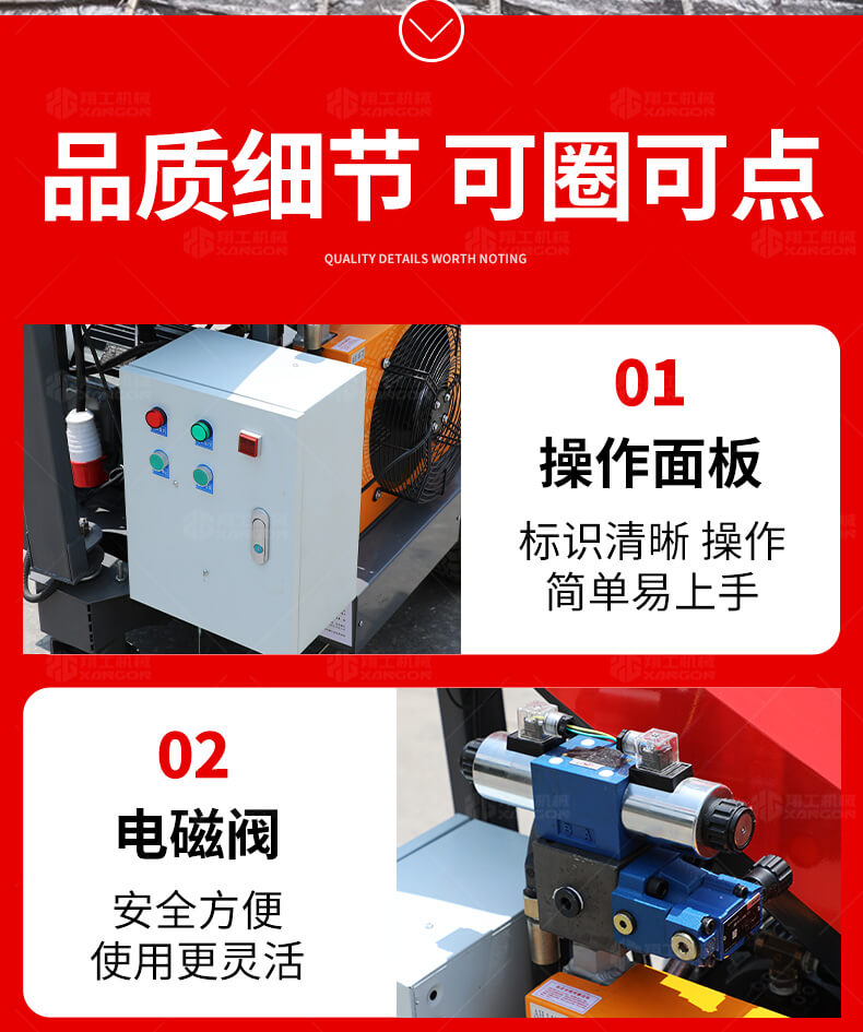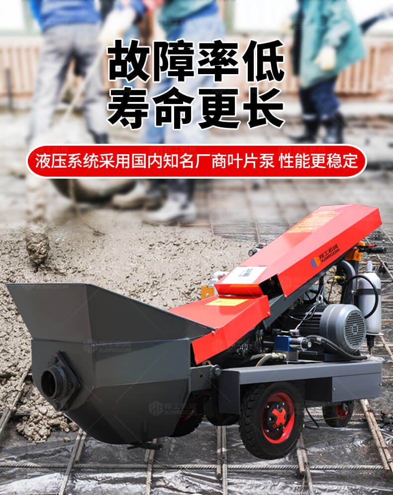 采用電動行走底盤,斜體式布局升降料斗,采用雙排風冷散熱系統散熱效果更好,液壓系統采用國內知名廠商葉片泵,故障率低,壽命更長,性能更穩定,超長行程料缸大大提高了輸送效率。
