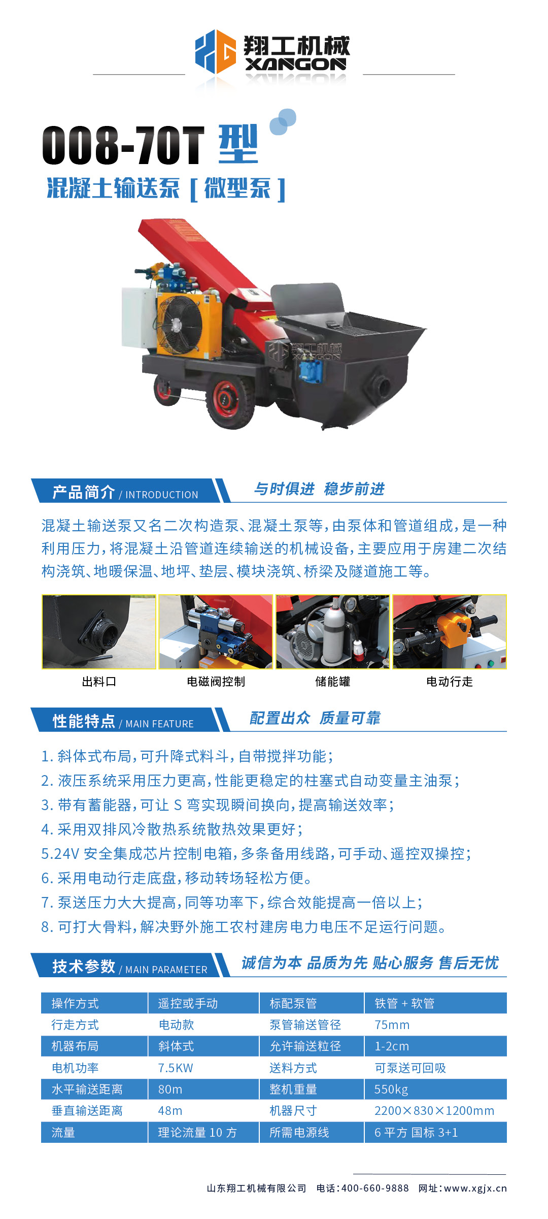 采用電動行走底盤,斜體式布局升降料斗,采用雙排風(fēng)冷散熱系統(tǒng)散熱效果更好,液壓系統(tǒng)采用壓力更高,性能更穩(wěn)定的柱塞式自動變量主油泵,料斗自帶攪拌功能防止骨料沉淀造成堵管,泵送壓力大大提高,同等功率下,綜合效能提高一倍以上。由于其功率較小,能打大骨料,解決了野外施工,尤其是農(nóng)村建房電力電壓不足,不能滿足大功率設(shè)備運(yùn)行的問題。
