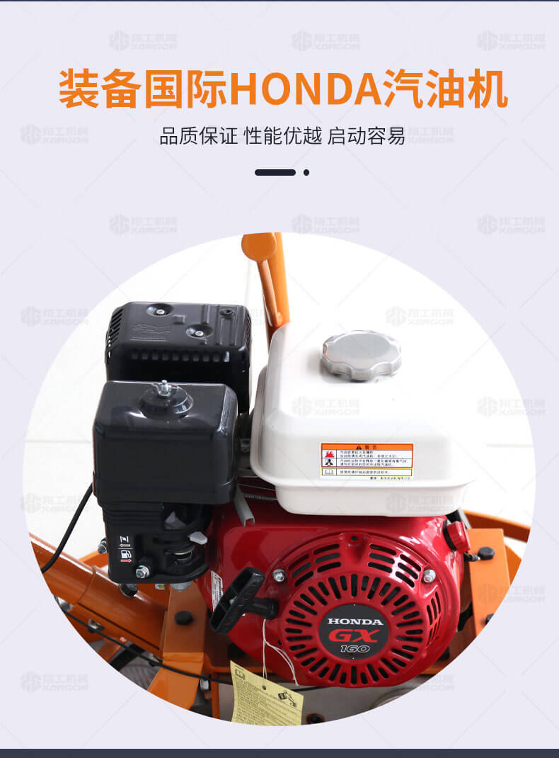 手扶抹光機用于混凝土地面的提漿、壓實、抹平、抹光。裝備國際品牌HONDA汽油機,品牌品質保證,性能優越,啟動容易;變速箱大模數設計,鋁合金箱體,免維護,使用壽命長;