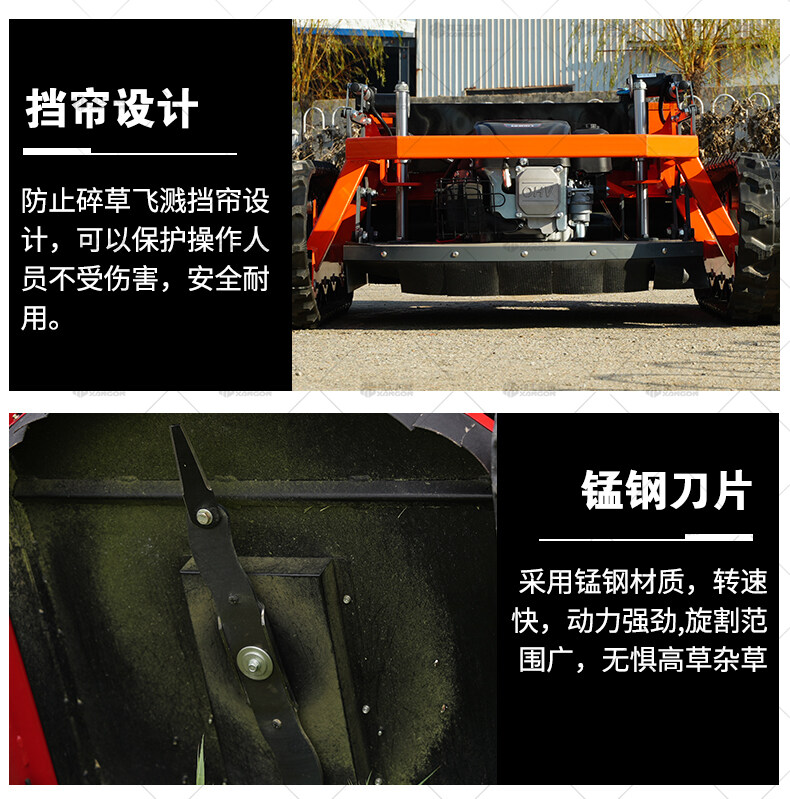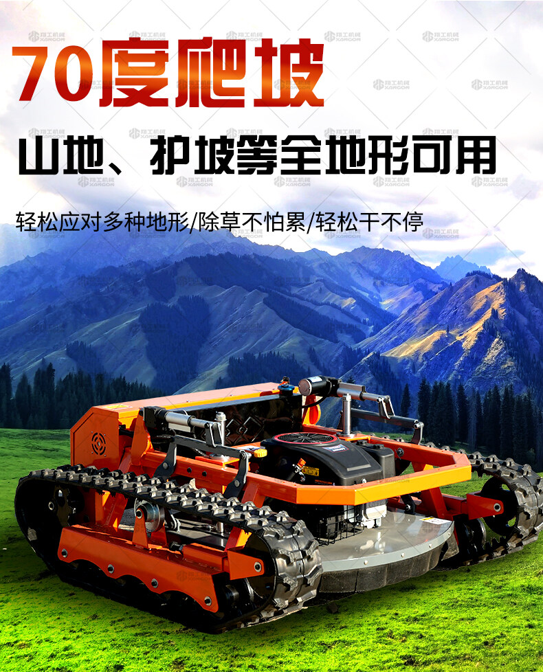 800坦克款割草機是一款專為復雜地形、高強度作業設計的重型遙控割草機,采用坦克式履帶底盤,具備極強的通過性和穩定性,適用于陡坡、泥地、灌木叢等傳統割草機難以作業的場景